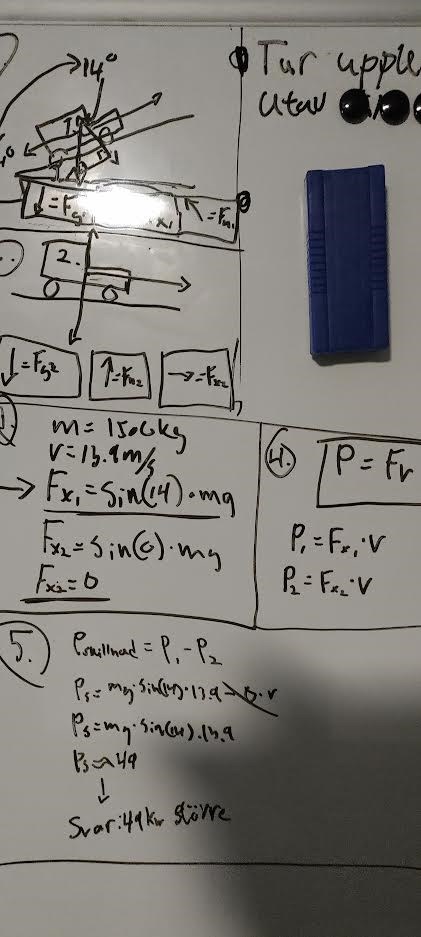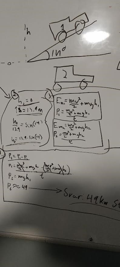 Tjena, jag får rätt svar efter jag räknat ut effekten för det lutande planet, sedan tar minus 0 då vinkeln 0 ger 0 i kraft. Det låter knepigt då effekten i bilen fortfarande bör existera när den åker på ett horizontelt med x axelns plan.