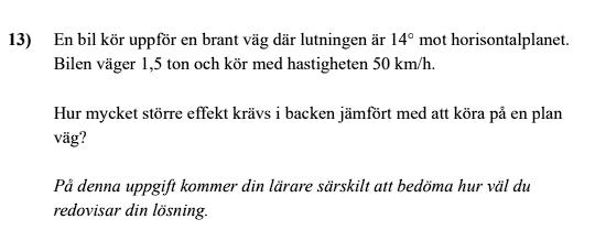 Bilen ökar då sin potentiella energi med mgh1500·9,82·503,6·sin(14°)49,5mgh\approx1500\cdot9,82\cdot\frac{50}{3,6}\cdot\sin(14^{\circ})\approx49,5 kJ varje sekund.