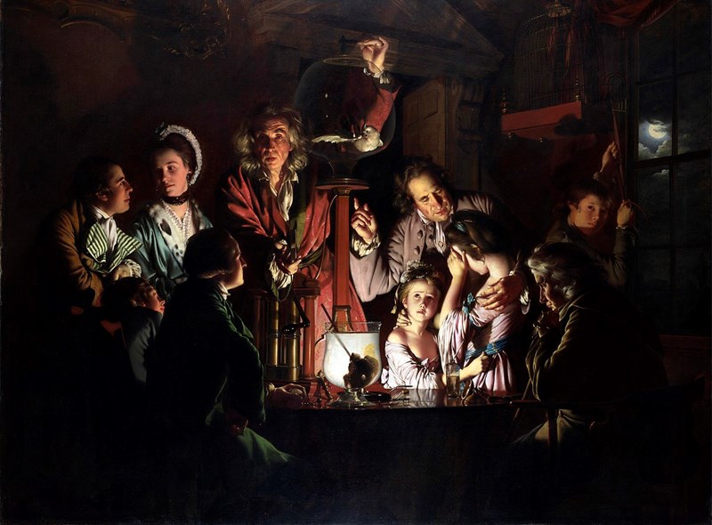 Why are they looking at an experiment? (Consider the date of the painting in your answer.)
