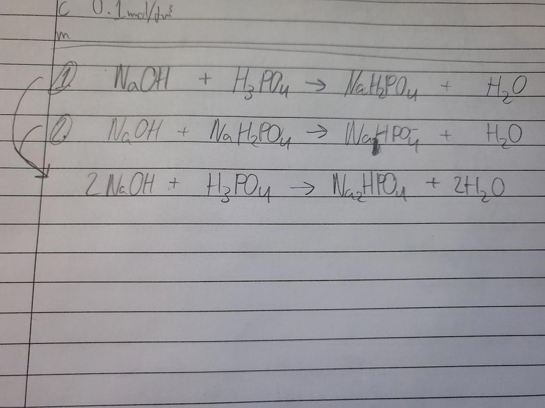 Vid första ekvivalenspunkten har 1 mol natriumhydroxid reagerat med 1 mol fosforsyra och bildat 1 mol natriumdivätefosfat och 1 mol vatten. Skriv reaktionsformel för detta.
