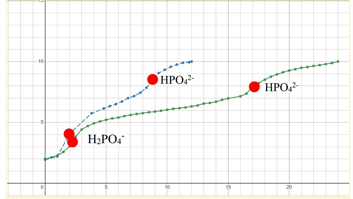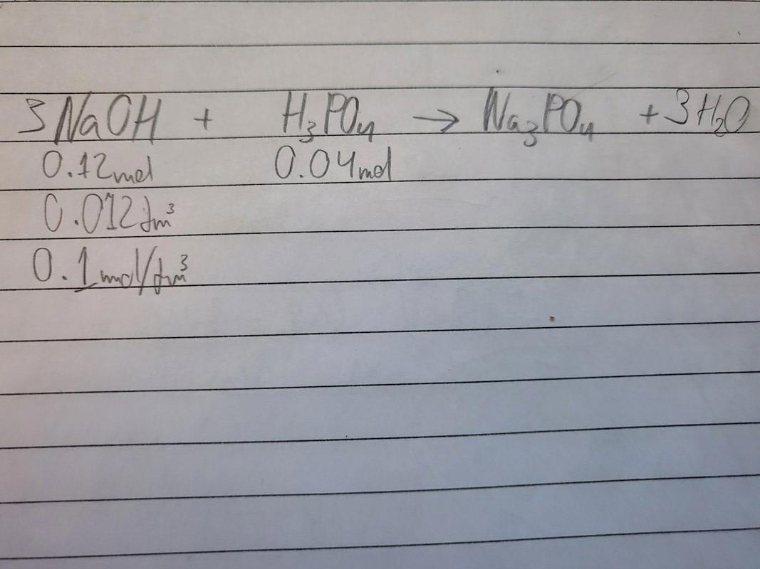 Såhär gick labbrationen ut. Jag hade 48ml kokad cola som då ska ha fosforsyra och vatten kvar. Jag sedan titrerade det med natriumhydroxid och jag behövde i slutet använda 12ml av natriumhydroxid (med koncentration 0.1 mol/dm^3) för att titrera det fullständigt och diagrammet är nedanför (ignorera den gröna funktionen). Jag har också lyckats beräkna att substansmängden av natriumhydroxid måste vara 0.12mol och fosforsyrans substansmängd måste då vara 0.04mol (se nedanför).