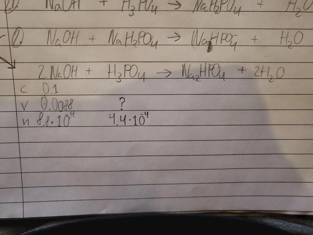 Du verkar ha läst av volymen korrekt (8,8 ml). Substansmängden NaOH är också rätt. Enligt formeln reagerar 2 mol NaOH med 1 mol H3PO4. Hur många mol H3PO4 reagerar då om det istället finns 8,8*10-4 mol NaOH?