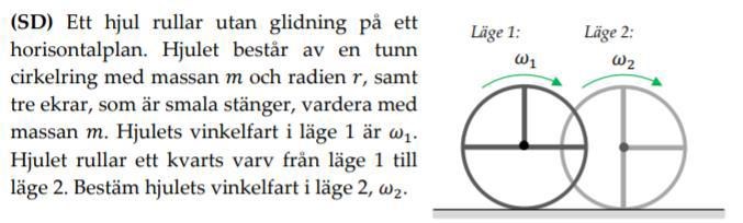 Jag tänker att du borde kunna räkna ut hur mycket hjulets masscentrum förflyttar sig (nedåt). Energin som frigörs från detta borde omsättas till att öka farten hos hjulet.