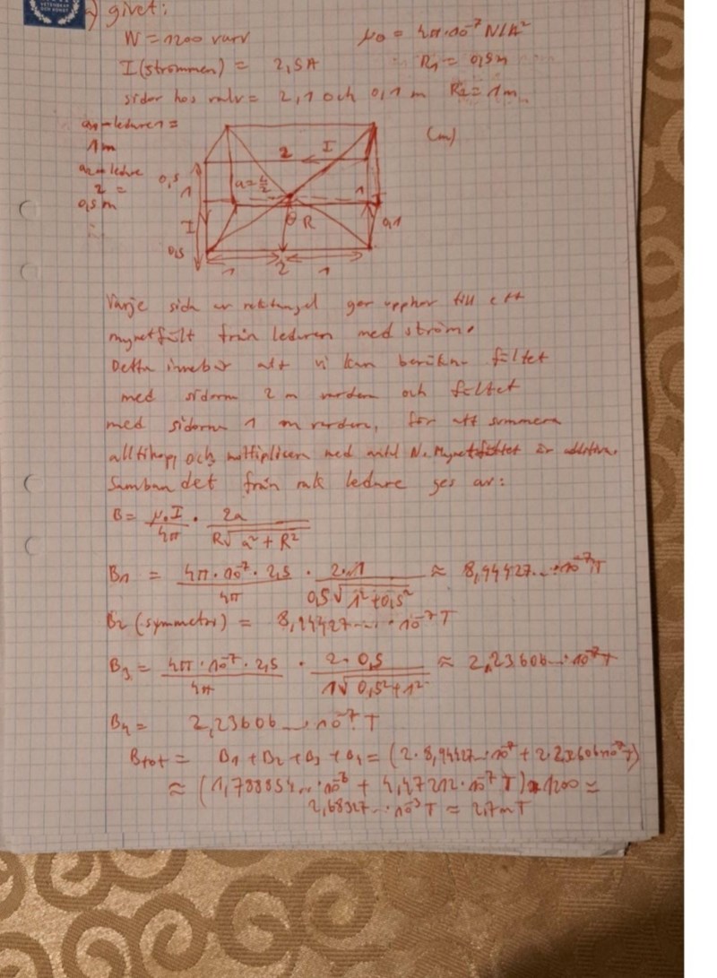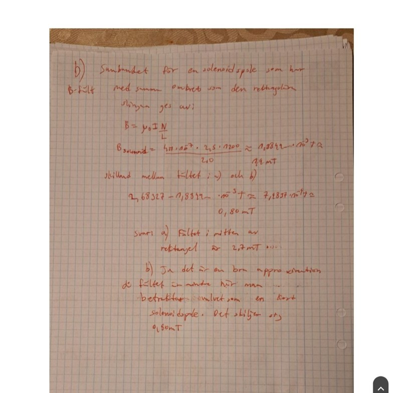 min lärare gav mig en kommentar om att jag räknade ut b fältet I b) uppgiften med fel formel. Tanken var att använda formel för kort solenoid spole(cirkelslinga). Menar han den där formeln B= INmy/2piR?