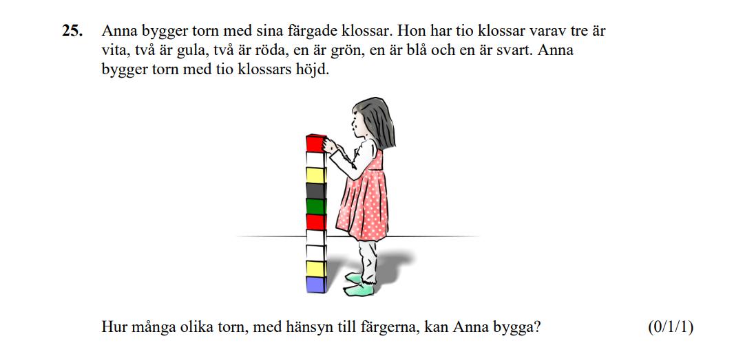 Först pacerar hon ut de "udda" klossarna grön, blå och svart. Detta kan göras på 10.9.8 olika sätt. Därefter väljer man 2 av 7 klossar som är röda (21 sätt), två av fem som är gula (10 sätt) och sedan finns det bara ett sätt att placera de vita klossarna. Totalt 151 200 sätt. Oj!