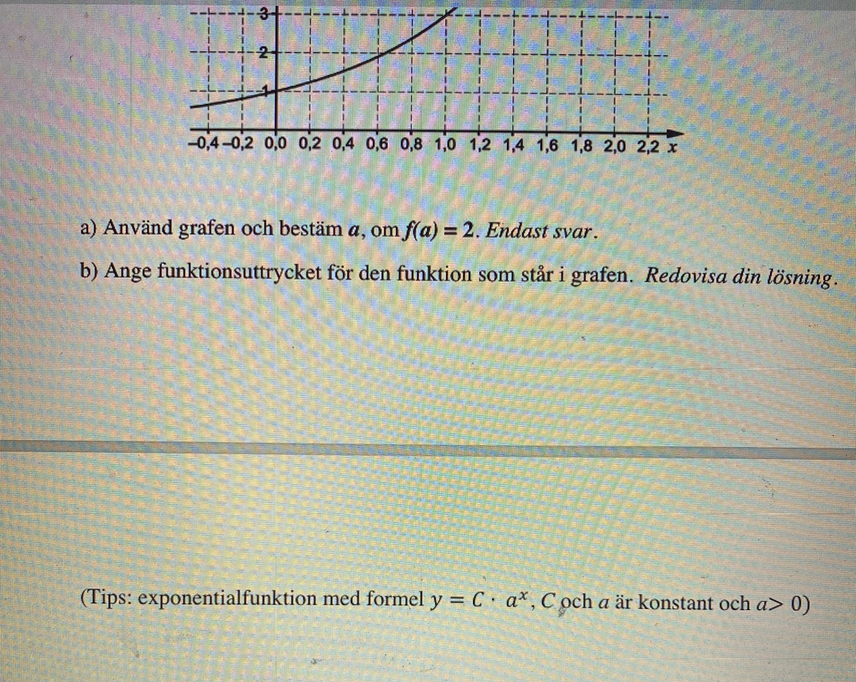 Om du sätter in punkten (0,1) i funktionen y = Cax så blir det 1 = Ca0. Uttrycket a0 har samma värden för alla a (utom när a = 0), så du kan räkna ut vilket värde konstanten C har. Sedan kan du sätta in pukten (1,3) och ditt nyss framräknade C i funktionen y = Cax och få fram värdet på a.