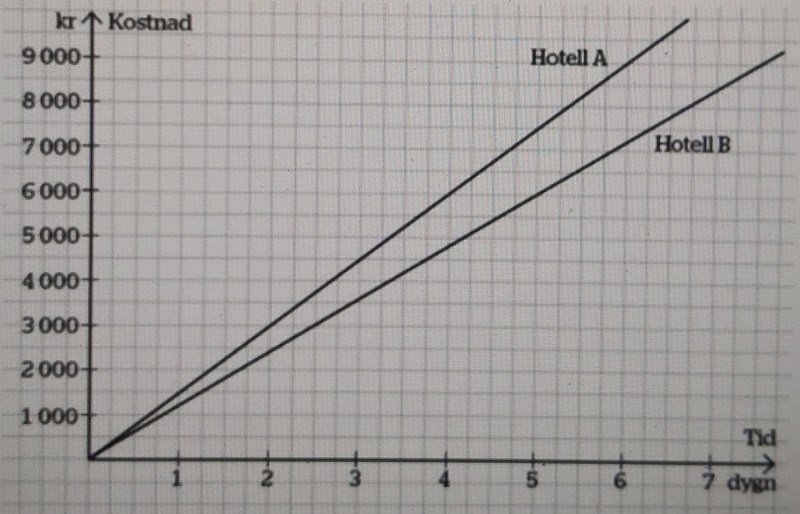Diagrammet visar sambandet mellan kostnaden y kronor och tiden x dygn för att bo på två olika hotell. Hur stor är prisskillnaden per dygn?