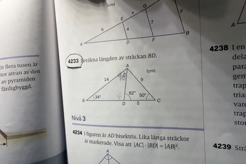 4233) Här har jag hittat alla vinklar i respektive triangel och då hittat att triangel ABD har vinklarna 48, 34 och 98, medan triangel ADC har vinklarna 48, 82 och 50. Detta betyder väll då att trianglarna inte är likformiga, och därmed kan väll inte bisektrissatsen användas?
