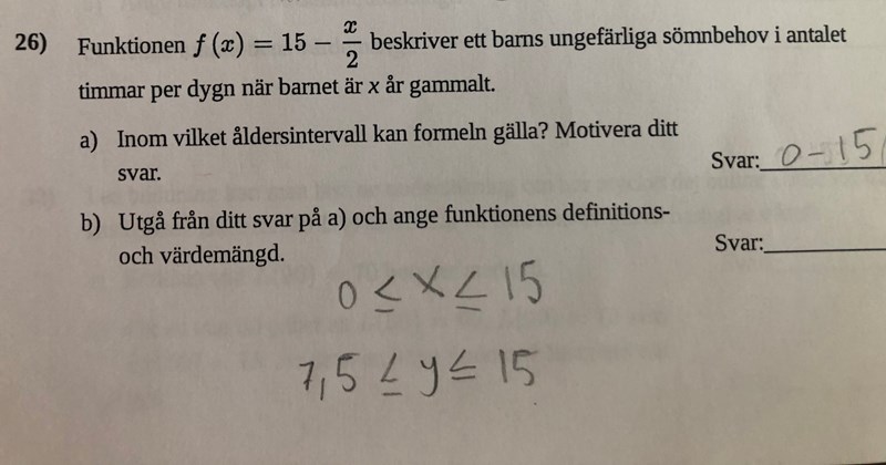Man brukar säga att en vuxen person bör sova 8 timmar per natt (jag tror att de flesta enligt denna definition sover förlite, även jag). Vilken gräns ger detta för när man är barn enligt denna formel?