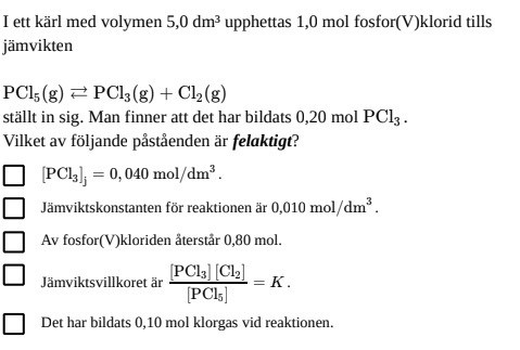 Jag behöver hjälp med denna frågan , jag vill veta hur man kan lista ut Cl2 mol. Hur kan man göra det med hjälp av molförhållanderna? För att kunna svara ifall jämviktskonstanten är 0,010M är korrekt eller inte!