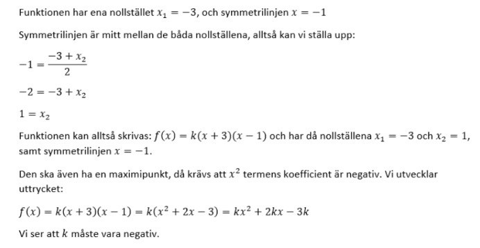 En andragradsfunktion har sitt ena nollställe i x=-3, symmetrilinjen x=-1 samt en maximipunkt. Skriv en andragradsfunktion i faktorform som uppfyller villkoren.