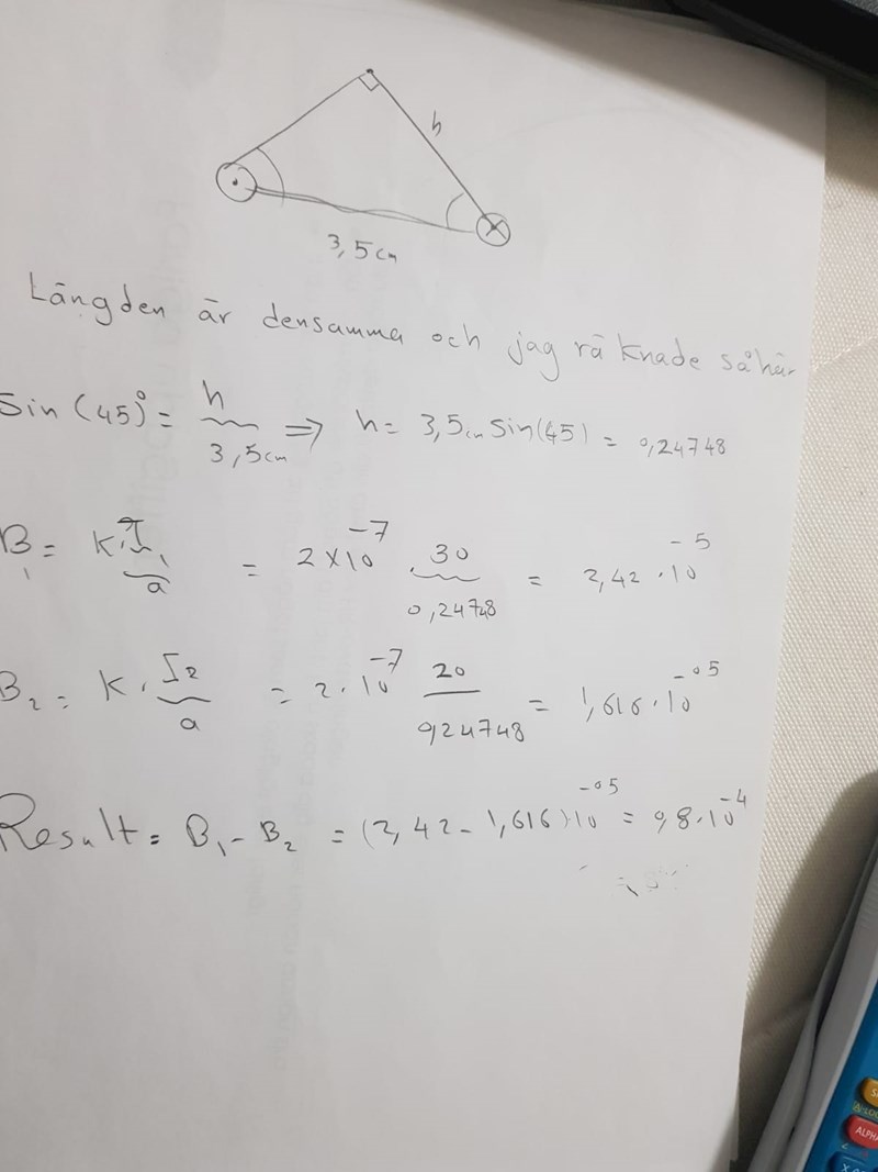 Vilket magnetfält får du då i punkten från vardera ledaren.