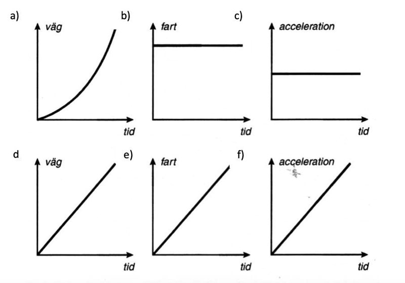 Missade dock att a) också är med c) och e) konstant acceleration. På a beror det på att hastigheten ökar rätlinjigt. Acceleration är derivata till hastighet, eller andraderivatan till sträcka-tid graf. Att derivera a) två gånger skulle ge en graf som liknar c)