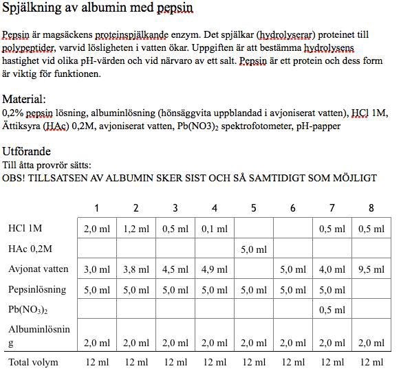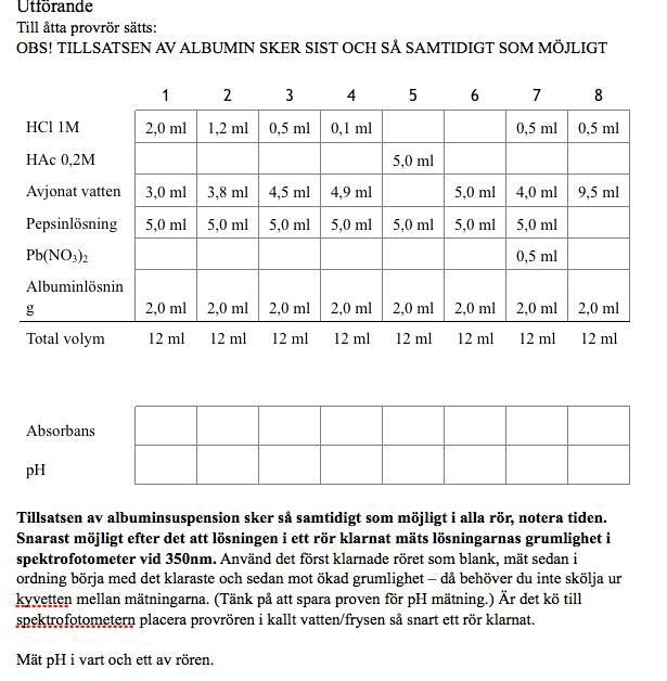 Enzymer katalyserar kemiska reaktioner och om jag tar en titt på denna tabell så kan jag se att proteinet albumin absorberade lite ljus (provrör 7). Kan det betyda att bly har bundit till enzymet pepsin och därmed gjort så att reaktionshastigheten för hydrolysen har blivit lägre och därmed absorberade det lite ljus?