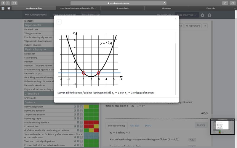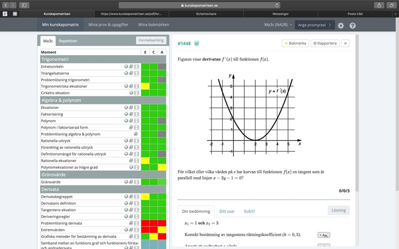 - f'(2) = 0, vilket innebär att f(x) har lutningen 0 vid x = 2.