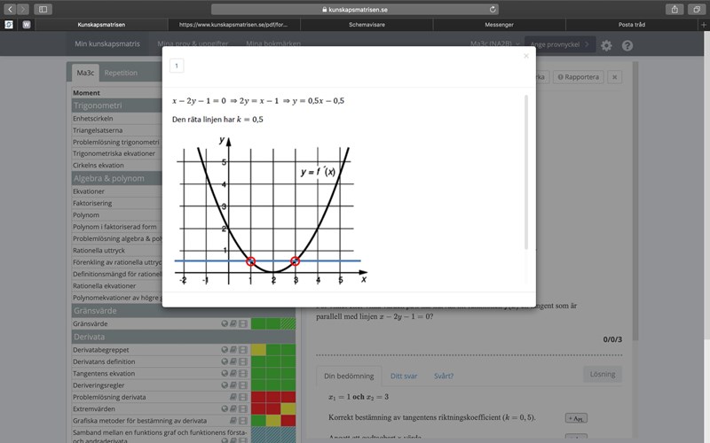 Nu frågar de efter det/de värden på x för vilka f(x) har samma lutning som linjen y = 0,5x - 0,5.