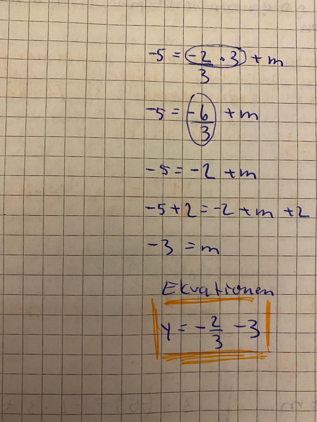 -Jag börja med att bara rita upp en graf och vidare pricka in punkterna (2, 4) och (–1, 6) och drog vidare en rät linje genom de punkterna och tog fram ekvationen. Tog K värdet från den ekvationen, in till första linjen och därifrån med hjälp av koordinaten (3,-5) få fram en ekvation. Ekvationen jag fick fram var fel.