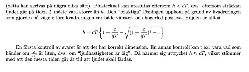 RandomUsername skrev:Det som finns inuti parantesen är dimensionslös, om du testar c/gT får du att den inte har någon enhet, därför är endast cT utanför parantesen det som har en enhet, och den får man fram till meter vilket stämmer med h som är en höjd.