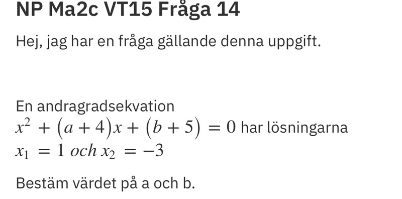 vilket jag fick fram genom att sätta in dina värden på a och b. Testa nu att sätta in x-värdet 1. Gäller likheten? Sen testar du -3. Om likheten stämmer i båda fall så har du rätt: med dessa a-värden har ekvationen rätt lösningar.