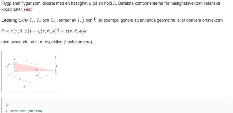 Största problemet är att få hastigheten v. Kolla för att få hastigheten så måste vi derivera längden/radien. Vi kan ju använda den för vad (x, y, z) var lika med men då har jag kvar basen i,j,k och då går det göra basbyte men då blir det för komplicerat. Jag fick i alla fall x=bcot (theta)