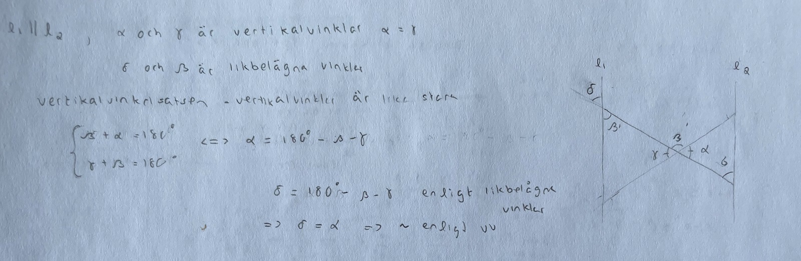 Jag tänkte också på alternatvinklarna men blir förvirrad över vad som är alternatvinklarna. Är det såhär? Då kan man motivera att de är likformiga enligt vv?
