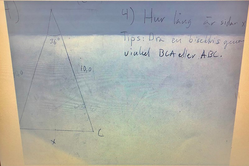 Rita en vettig triangel som inte ser liksidig ut. Då kommer du att hitta ytterligare två sträckor som har längden x. Du hittar också två likformiga trianglar, som man kan använda för att beräkna värdet på x.
