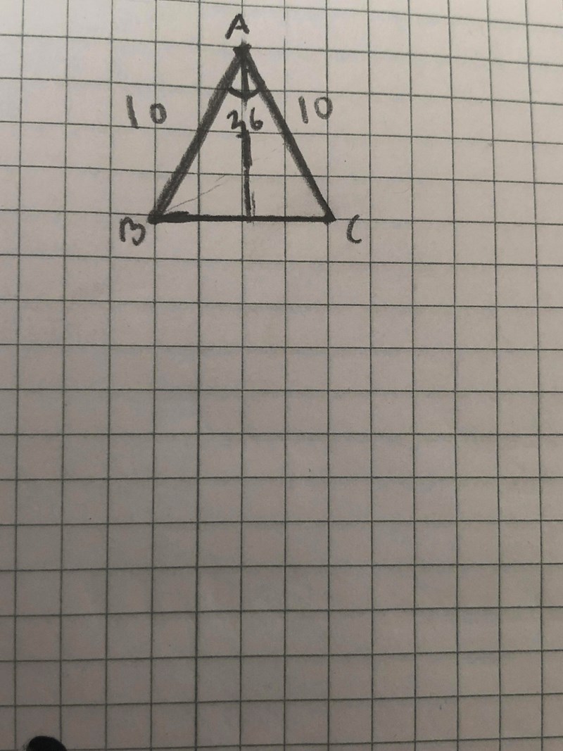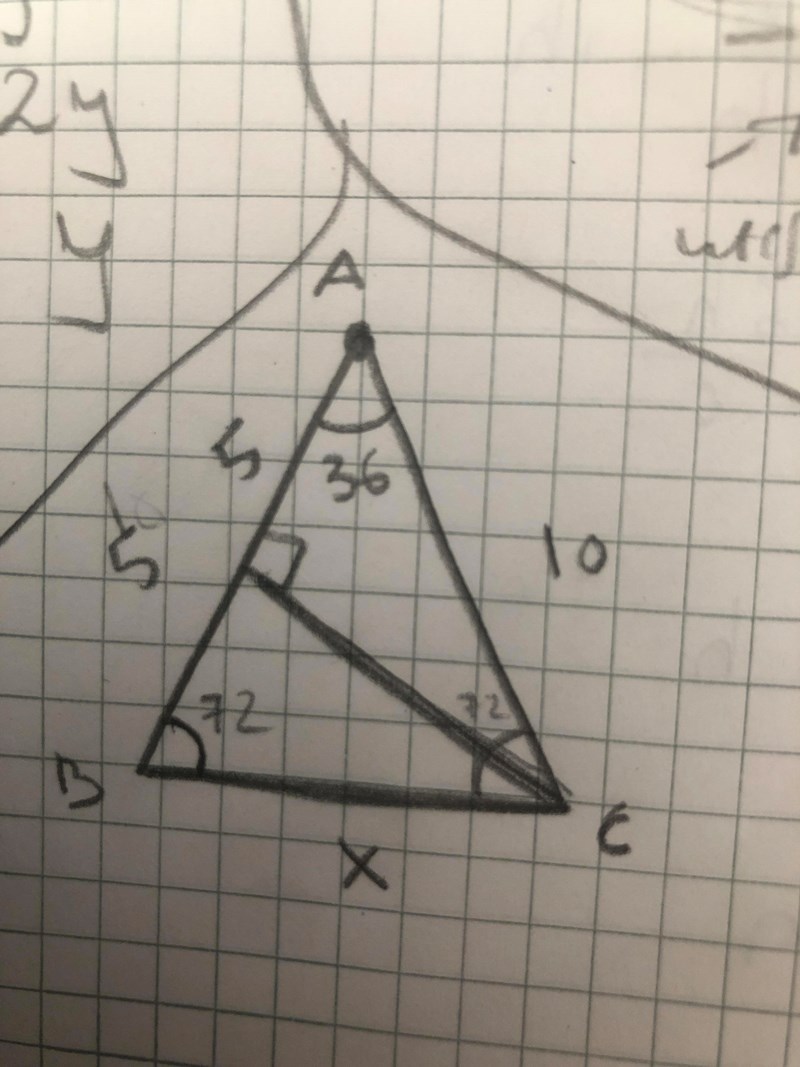 Varför följer du inte tipset från uppgiften? Nu har du skrivit dit två motstridiga påståenden: antingen kan du ha ritat en höjd i triangeln, så att vinkeln är rät, eller också kan du ha ritat en median, så att linjen träffar mitt på långsidan. Inget av detta är en bisektris, som man tipsade om.