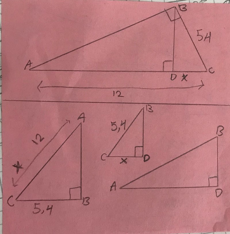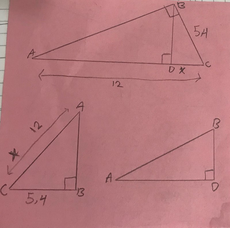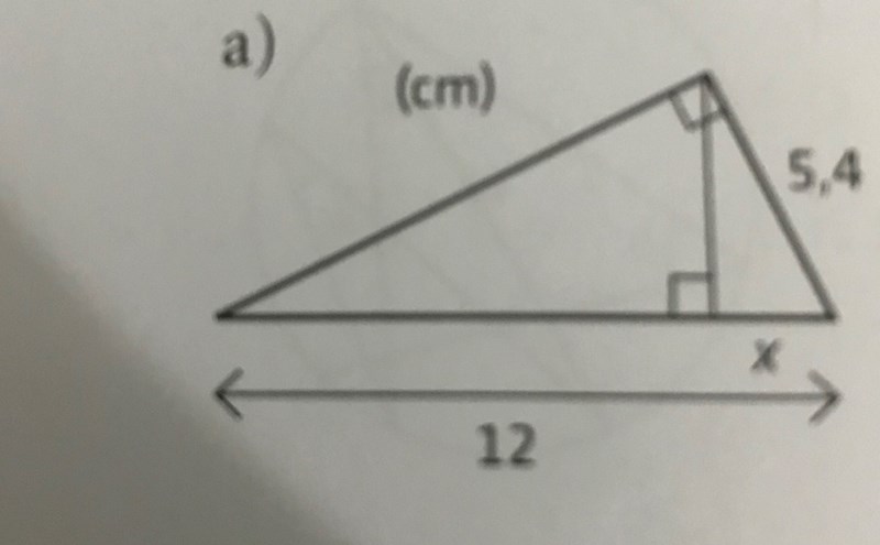 min försök är att använda Pythagorassats ; (12-x)^2+b=5,4^2 men svaret bli fel.