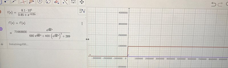 Uppgiften frågar efter när tillväxthastigheten är som störst, det som beskriver tillväxthastigheten är ju derivatan. Vi vill hitta maximipunkten på derivatan. Det kan du göra genom att ta derivatan av derivatan och hitta nollstället där. Men jag tror att du bara ska använda digitala hjälpmedel för detta eftersom derivering av sådana här funktioner inte är matte 3.