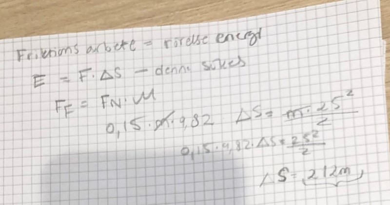 En bil kör på en rak väg med hastigheten 90 km/h. Vägen är isig och hal. Friktionstalet mellan däck och vägbana är endast 0.15. Bilen saknar ABS-bromar och bromsar maximalt med låsta hjul. Hur lång blir bromssträckan?