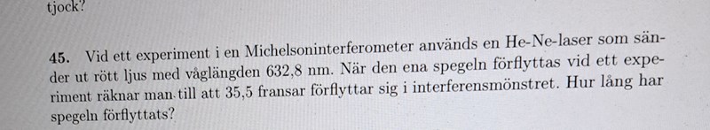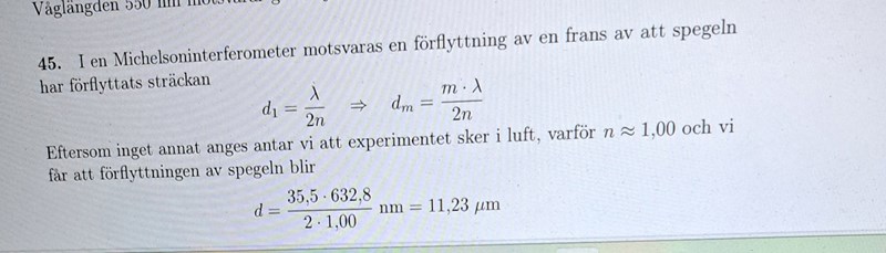 Jag förstår inte varför facit går från d1=lambda/2n som jag använde för att få ut förlyttningen till d_m=m*lambda/2n. Hur vet de att detta rör sig om konstruktiv interferens där d_m=m*lambda/2n kommer ifrån?