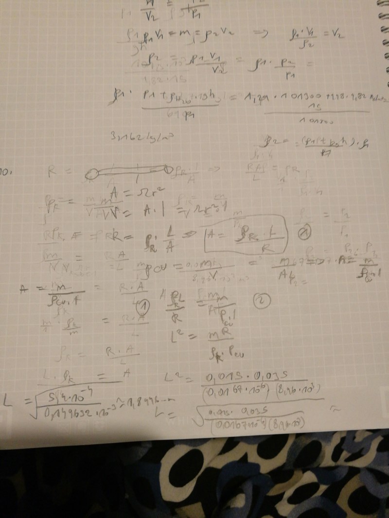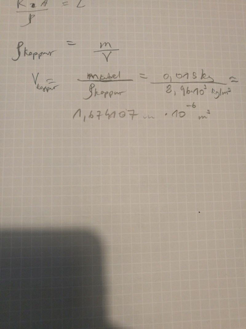 Vi vet att R = resistivitet *L/A så vi kan skapa ekvation 1 som heter A = Resistivitet för koppar *L/R. Sen har vi densitet formeln som är råkoppar = m/V som kan skrivas om till m/A*L. Utifrån det kan man skapa ekvation 2 som är A = m/råkoppar *L. Sen tänkte jag att vi sätter ekvation 1 och 2 lika med varandra.
