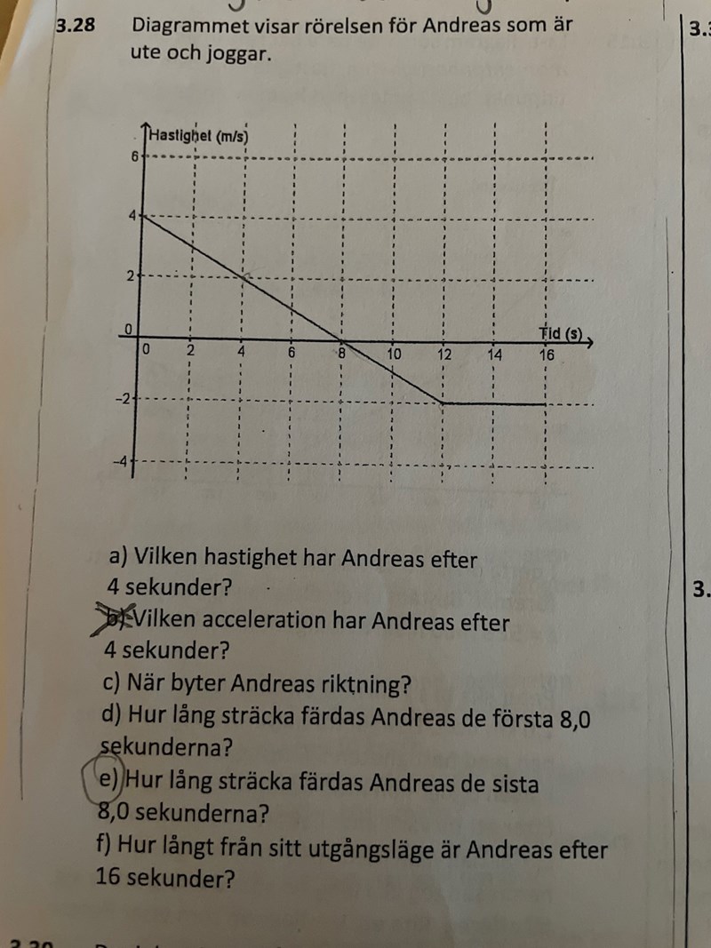 Om han skulle hålla hastigheten 4 m/s i alla 8 sekunder skulle du kunna beräkna sträckan med s=v•t=4•8=32 m. Men nu ändras hastigheten på vägen.