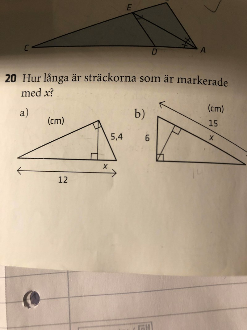 Jag menar fråga a. Hela triangeln och den större triangeln inuti är ju likformiga men förstår inte hur jag ska använda mig av det när jag inte har längden på den större triangeln inutis sida sm motsvarar hela triangelns sida 5,4 cm.