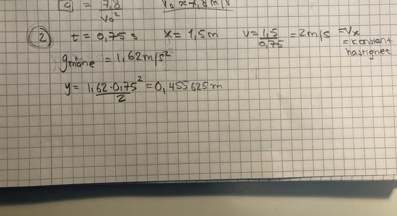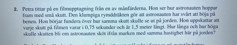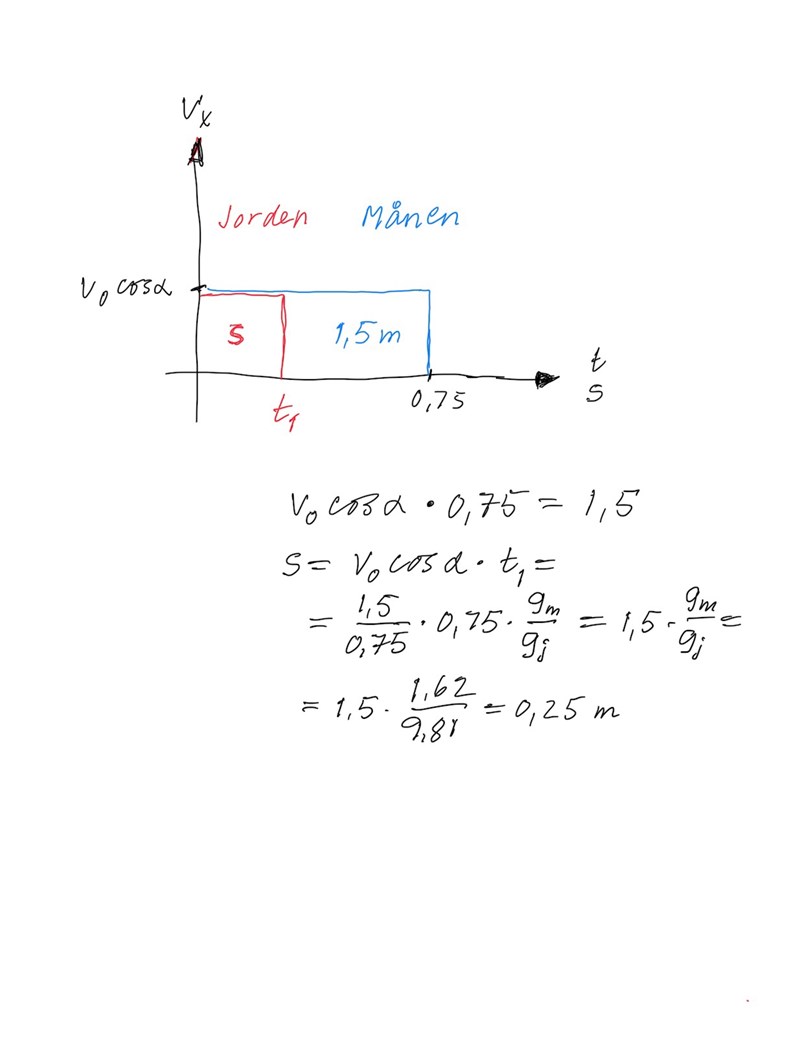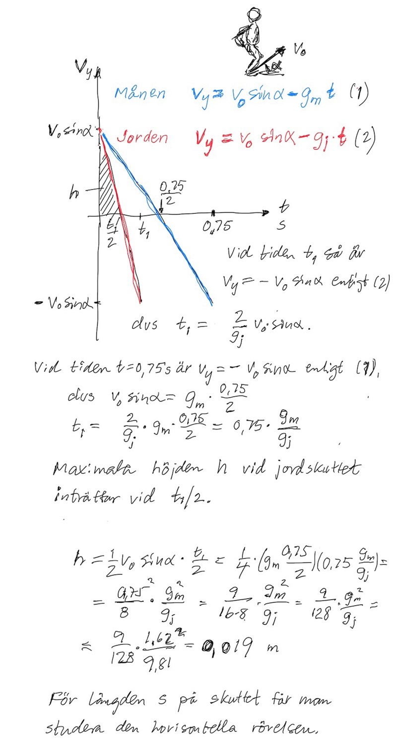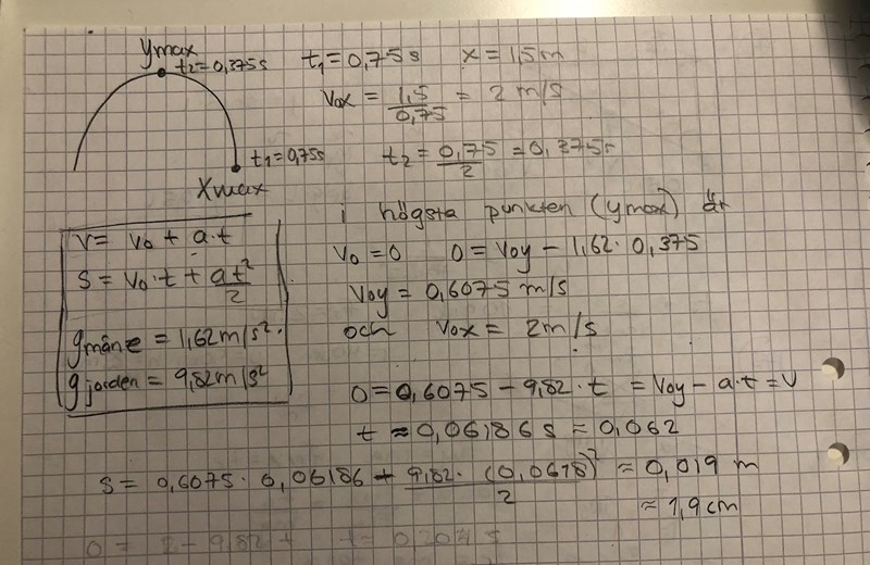 Om vi struntar i den horisontella hastigheten (din x-led) så ser vi att astronauten var i luften 0.75 s. Halva den tiden hoppade han upp, och efter (0.75/2) sekunder ramlade han neråt igen.