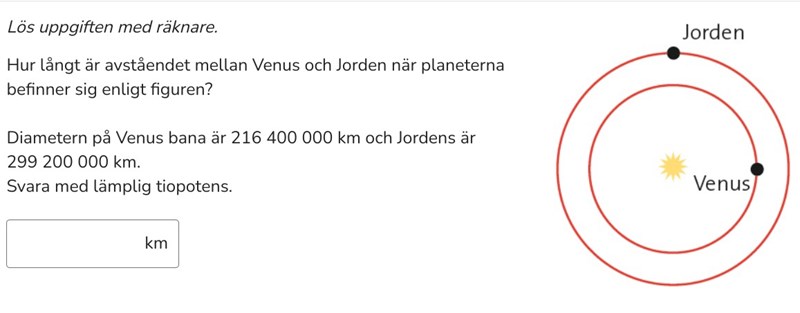 Hur långt är avståendet mellan Venus och Jorden när planeterna befinner sig enligt figuren?