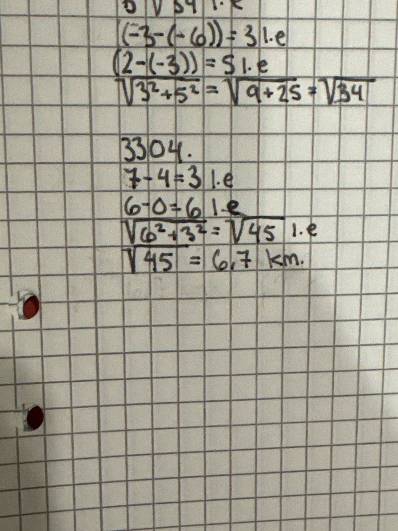 Läget för en ort A kan anges med punkten (0,4) och för en annan ort B med (6,7). Hur längt är det fågelvägen mellan orterna om 1 längdenhet i koordinatsystemet motsvarar 1 kilometer i verkligheten?