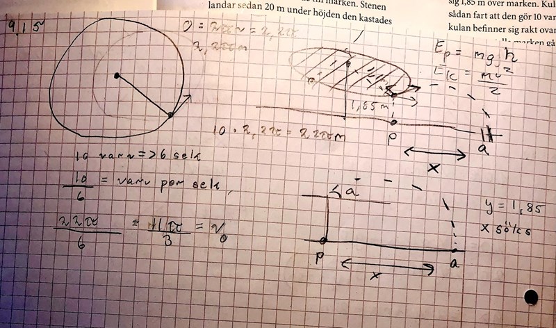 Jag tänker att Omkretsen är 22pi m alltså är hastighten i m/s = 22pi/6 = 11pi/6, detta antar jag då är hastigheten som kulan har precis när snöret går av.