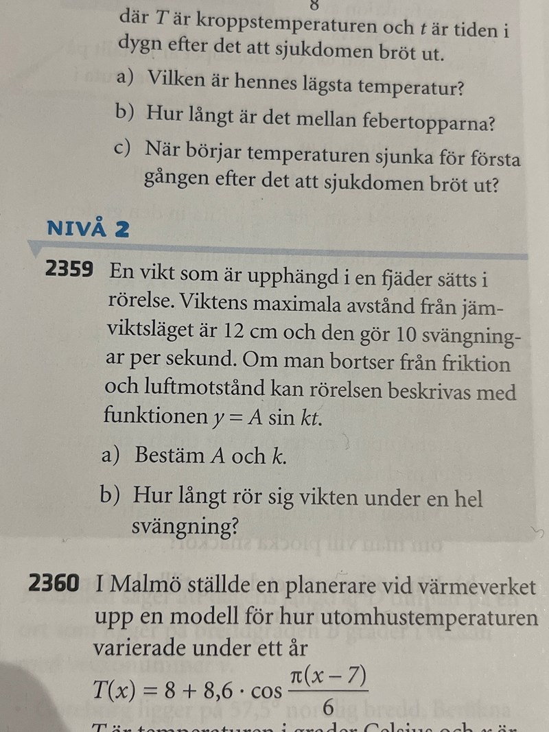 Kan du förklara vad det är du inte förstår? Det jag har skrivit är det som står i uppgiften. Vet du vad det menas när man säger att "En vikt som är upphängd i en fjäder sätts i rörelse"?