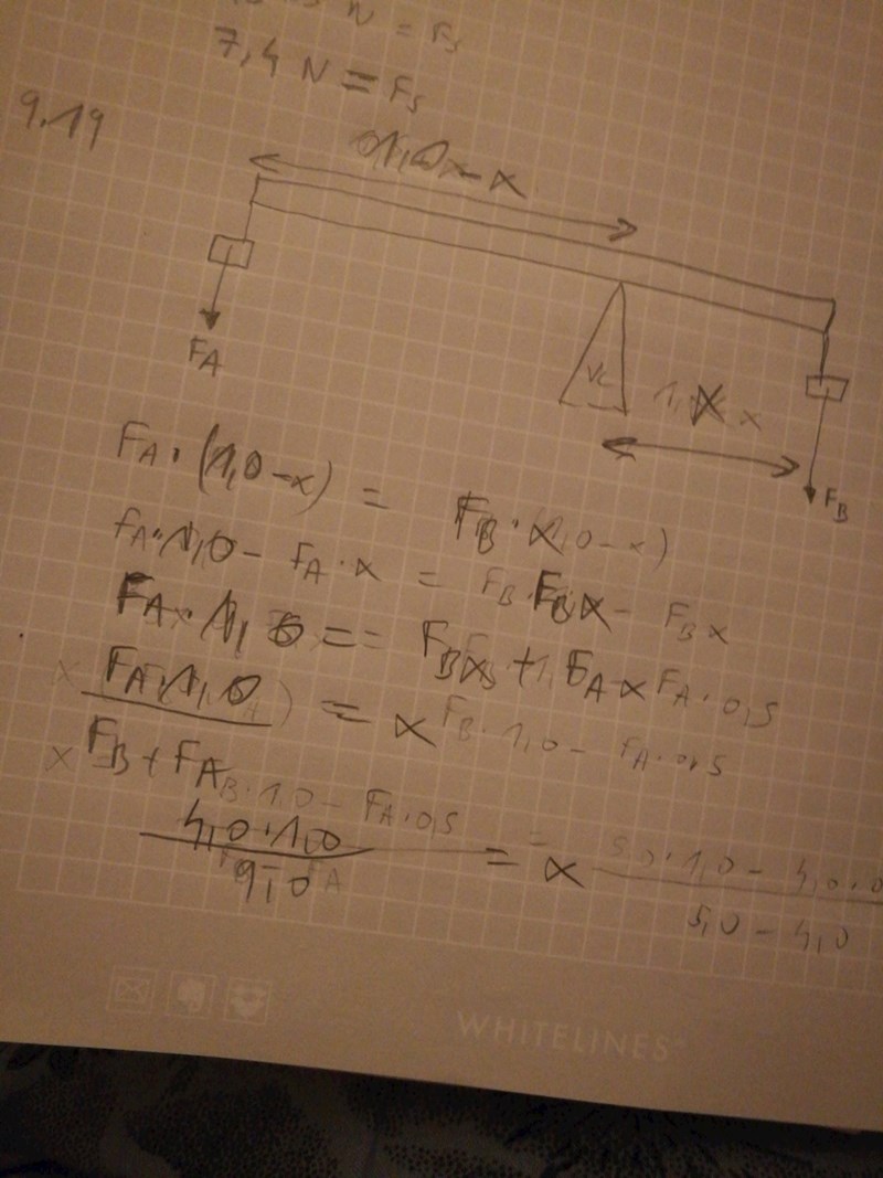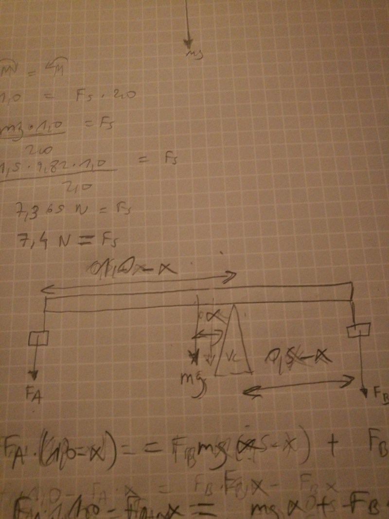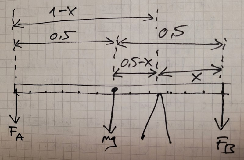 Om vi säger att moturs är positiv riktning så blir alltså jämviktsekvationen FA•(1-x) + mg•(0,5-x) - FB•x = 0