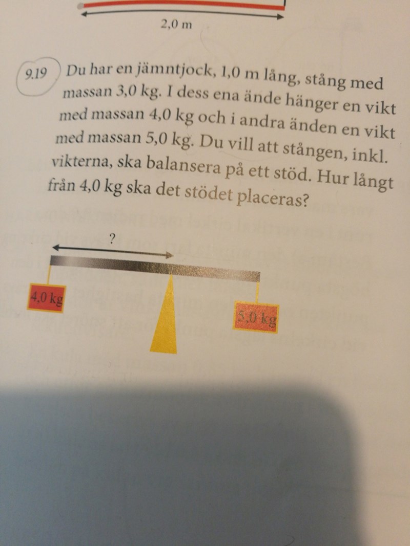 Men ännu bättre vore det förstås om du kallade avståndet mellan stödet och 4,0 kg-vikten för x, dvs att x betecknar det som efterfrågas. Då slipper du komma ihåg att göra den sista beräkningen 1-x.