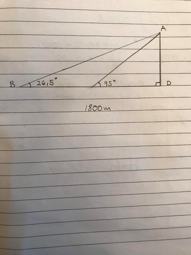 Lite otydligt i din bild men det är inte BD som är 1800m, det är BC om C är den punkt som inte är markerad där vinkeln är 45 grader.