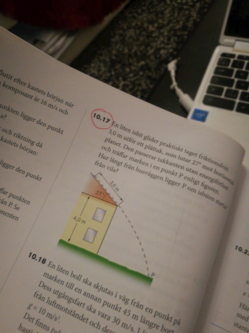 Du kan se det som att man kastar isbiten från takkanten snett nedåt med en hastighet v0 och vinkeln -27 grader.