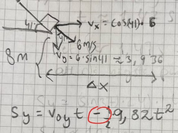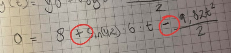- Du skriver först +9,82t2/2 men byter sedan till -9,8t2/2.