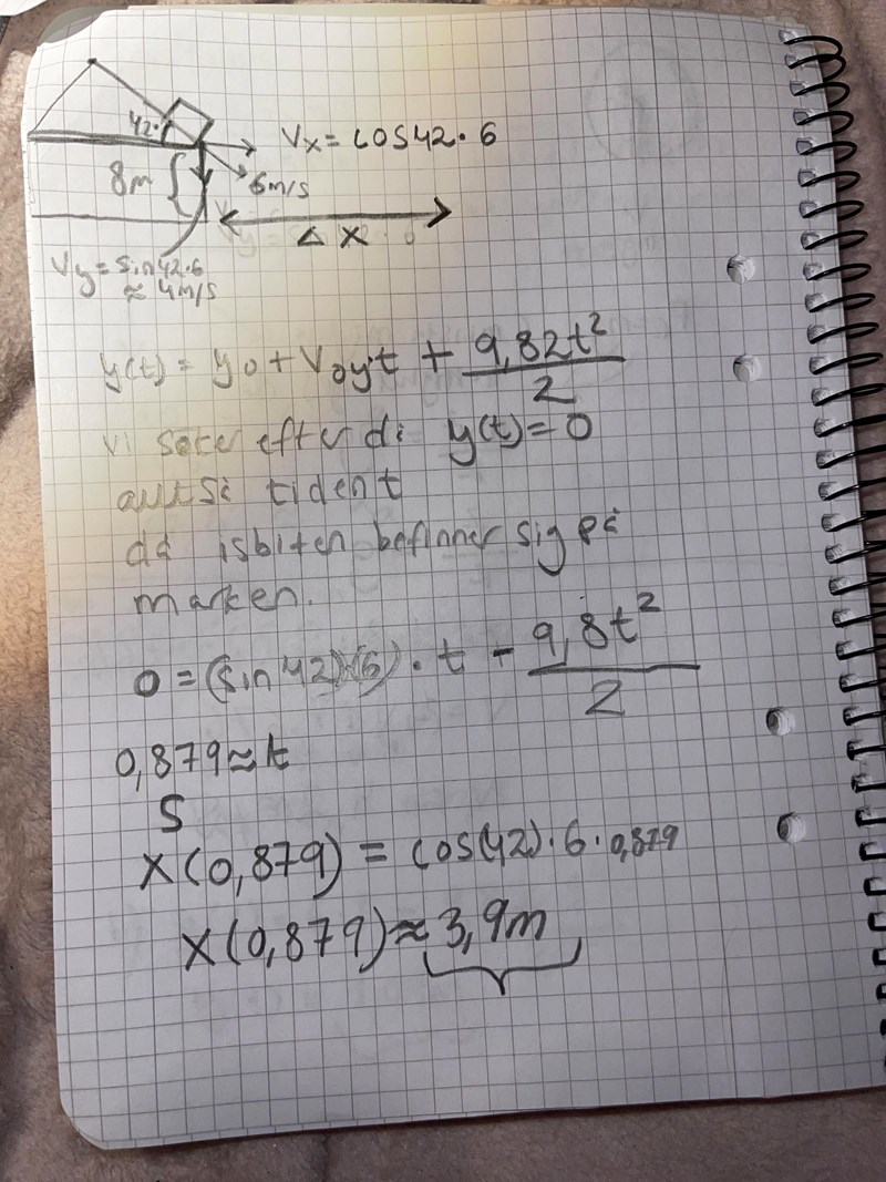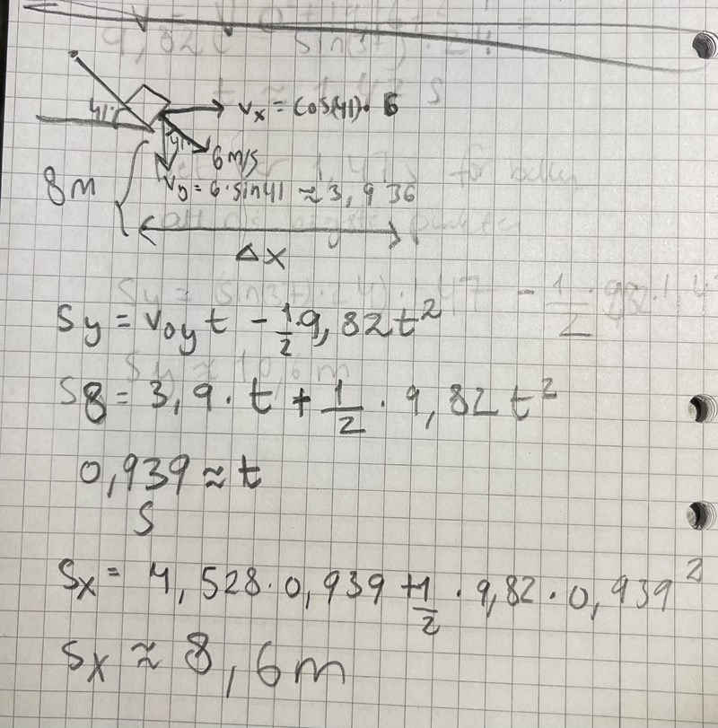 En isbit glider med försumbar friktion nedför ett hustak som bildar vinkeln 41° med horisontalplanet och lämnar taket med hastigheten 6,0 m/s.