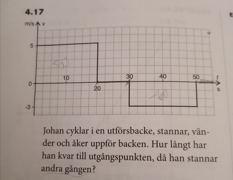 Han stannar för andra gången vid 50 s, innan dess har han cyklat 50 m nedför backen (positiv riktning). Sen så har han vänt och cyklat 60 m uppför backen (negativ riktning). Då borde han vara 10 m från ursprungspositionen? Men det står 40 m i facit och jag förstår inte riktigt hur de har kommit fram till det.