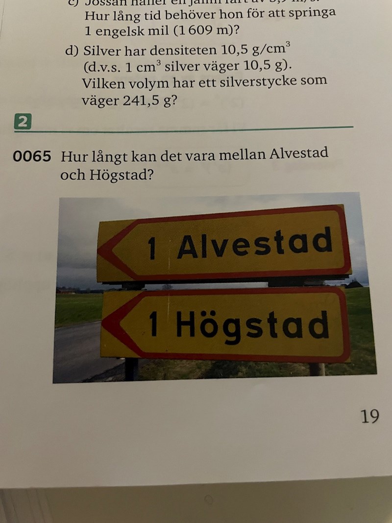 Att det står 1 km på skyltarna betyder inte att det behöver vara exakt 1 km, utan talet kan vara avrundat. Man skriver ju aldrig ut 1,4 km eller 0,9 km på skyltarna, utan värdet avrundas. Frågan är egentligen: Vad det längsta möjliga avståndet mellan Alvestad och Högstad?