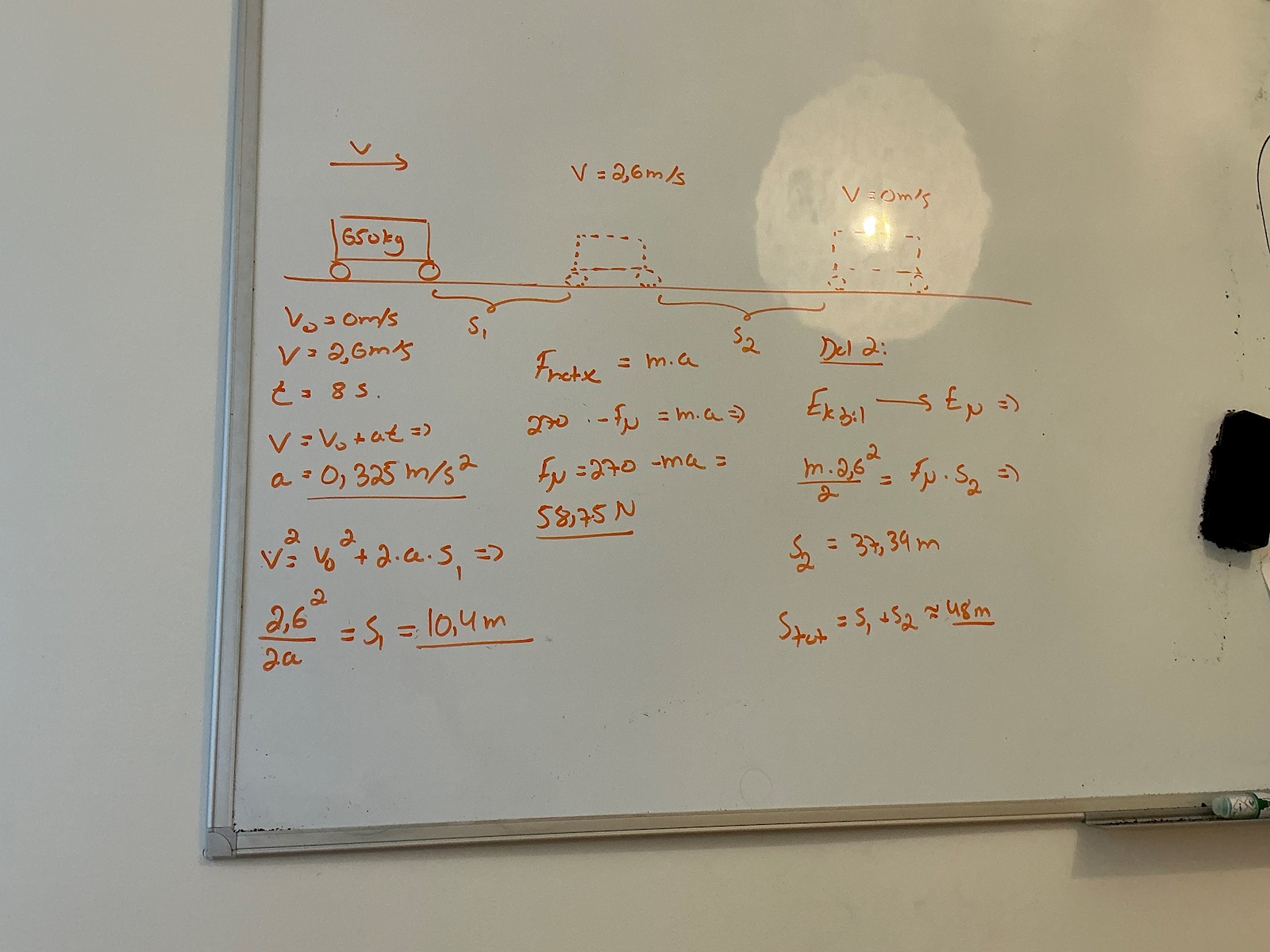 mv^2 / 2 = Ff * s. Problemet är att jag inte har friktionskraften. Jag tänker att rörelsemängd och impuls är optimalt för att lösa frågan men jag har ju redan alla värden: dvs. v0, v, kraften (270 N) och tiden (8 s). Vad är det jag missar?