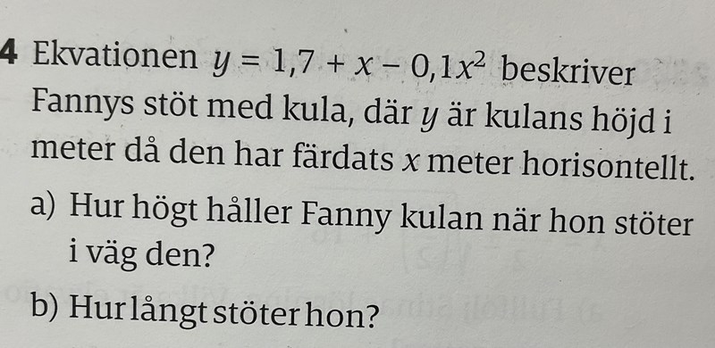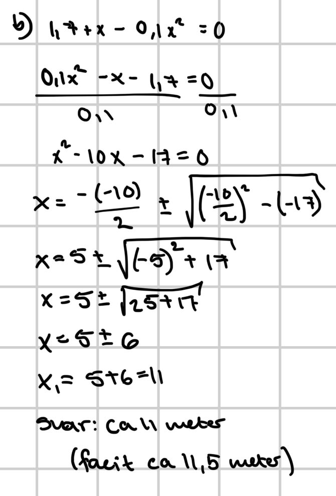 Själva lösningen var inte så svår, men jag kommer fram till ca 11 meter, medan det i facit står 11,5 meter. Min första tanke var att jag avrundat för grovt i uträkningen när jag tog roten ur 37, men det var inte alls så, även om man tar hela talet på miniräknare och adderar 5 får man fortfarande ett tal som 11 eller 11,1 om man är generös. Har ingen aning om vad som blev fel, gjorde ett liknande fel i en tidigare uppgift, men struntade i det och tänkte att det bara blivit något fel i avrundningen eller så. Men eftersom att det är andra gången det sker så tänker jag att det är bättre att faktiskt förstå vad jag gör för fel. Ett sådant misstag kan ju bli kostsamt på prov. Åter till min fråga, här kommer min lösning, hade varit väldigt tacksam om någon kunde kolla över den och se om det går att hitta var jag gjort fel.