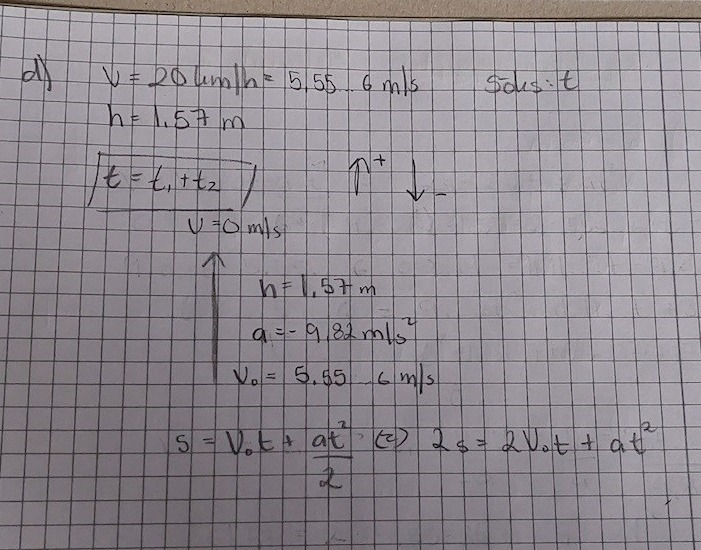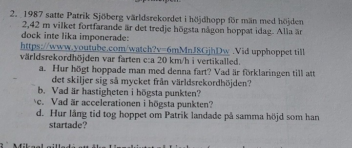Hej! Jag vet inte hur jag ska lösa uppgift d). Har en gissning på att t = t+ tdär tär tiden det tog för Patrik att hoppa upp och t2 är tiden det tog honom att komma ner igen. Jag får däremot bara fel svar i slutändan. Om någon kan hjälpa mig är jag förevigt tacksam :)